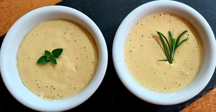 Because we were doing a taste test, I thought I’d be tricky and use a Boursin container, but the colour is quite yellowish, so it was pretty clear from the get-go which one was mine.