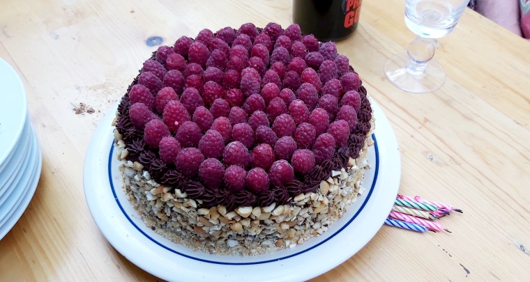 And speaking of Bid, she always brings dessert for our Friday Feasts and a few weeks ago, I set her the seemingly impossible task of making a vegan, gluten-free birthday cake for our friend Bob who was turning 169 on July 3rd. True to form, Bid made the most amazingly rich vegan cake that also happened to be gluten-free…and BEAUTIFUL!! She made the cake from eatwithclarity’s recipe and used the following method for her vegan ganache: