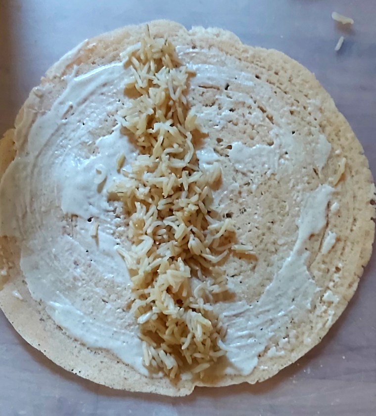 Next, make some brown basmati rice, grab an avocado, fresh cilantro, and some salsa and start assembling! I schmeared a bit of cashew-dill dressing on the tortilla to start, but it’s not really necessary.