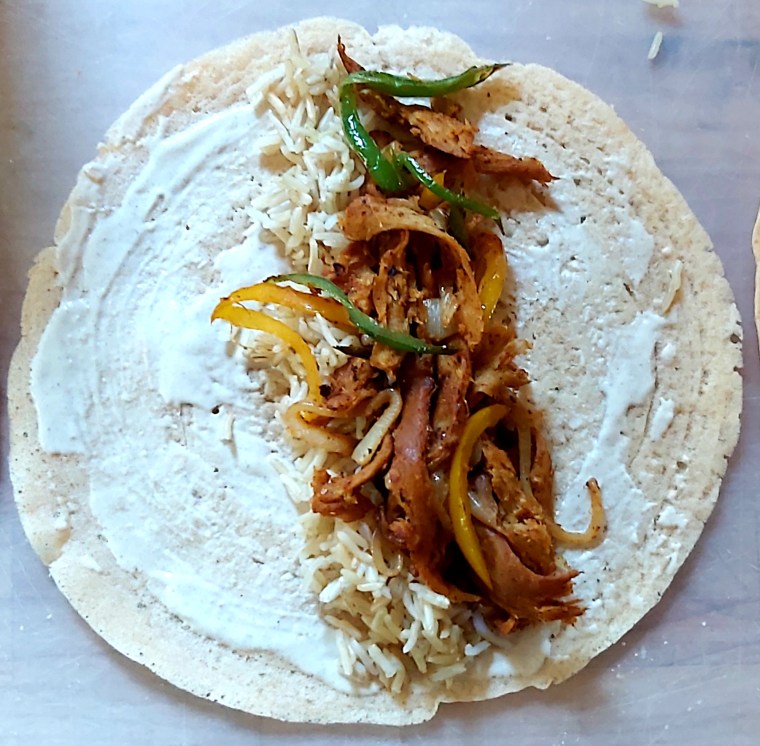 The burritos are more of an assembly than a recipe. First, make the filling (which is enough for six burritos):