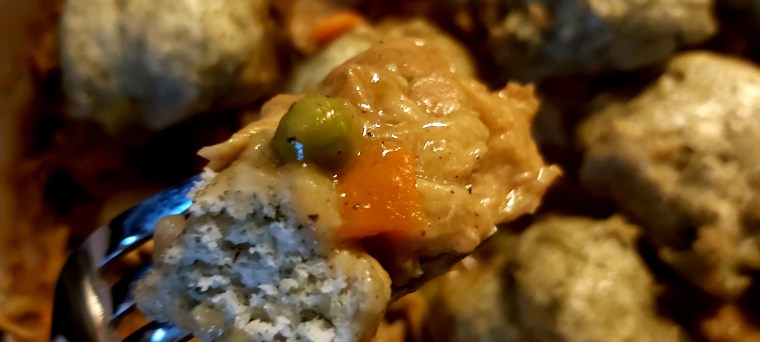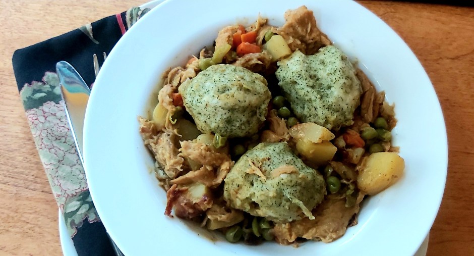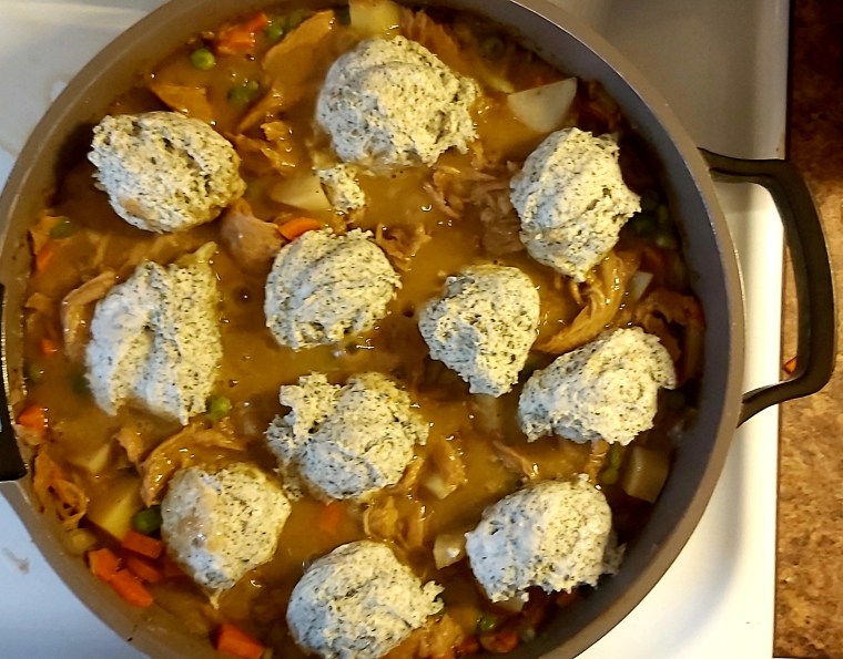 My darling niece Dana’s favourite meal when she was a child was chicken stew with dumplings, but “hot stuff and dumplings” is what she always called it. Dana became vegetarian when she was nine or ten and then became vegan when she was a teenager, so this recipe is in her honour! I used this recipe from Allrecipes and this recipe from Simply Recipes as inspiration.