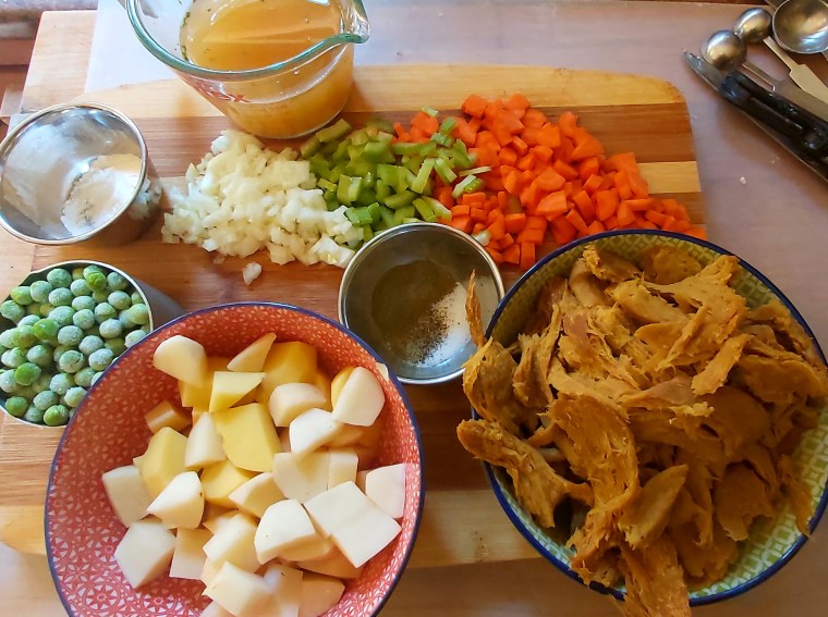 Melt one TBS vegan butter in a large saucepan and saute the chickwheat until nicely seared. Remove the chickwheat to a bowl and put aside. Melt the other TBS of vegan butter and saute the onion, celery, and carrot for about eight minutes until tender. Sprinkle the flour over top and mix with a whisk for a couple of minutes. Pour in two cups of the vegan chicken broth, whisking as you add it, until smooth and bubbling. Add the salt, pepper, poultry seasoning, potatoes, chickwheat, and peas. Simmer for eight or ten minutes until the potatoes are JUST fork tender. If the stew is looking a bit too thick, gradually stir in up to a cup more broth.