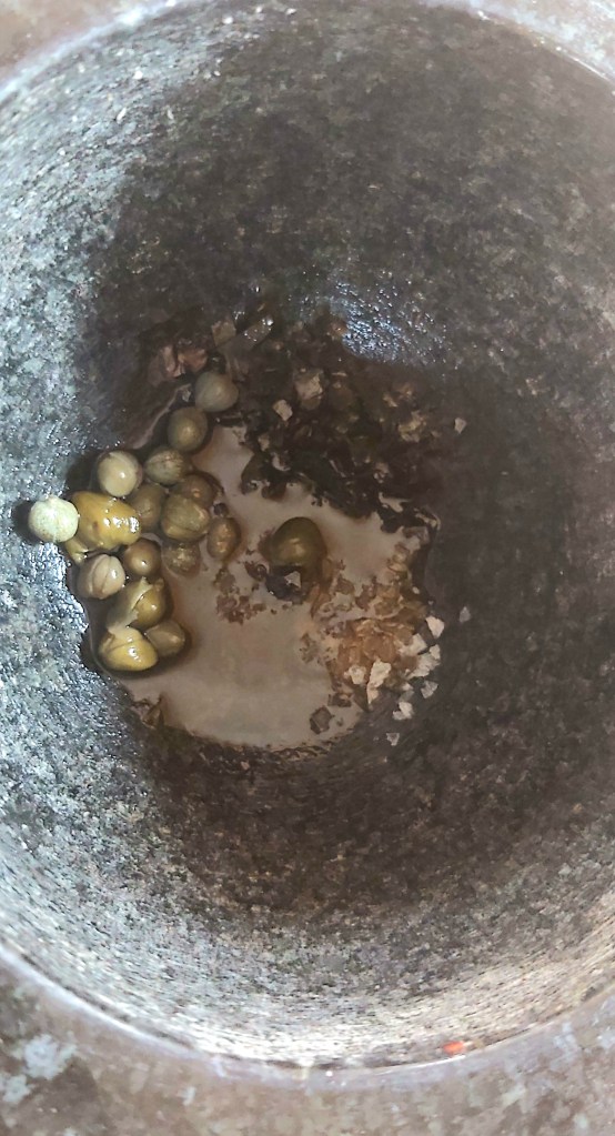 I got the idea from School Night Vegan‘s Instagram post explaining how to make a vegan anchovy, which is to blend 1/4 teaspoon of nori flakes, 1/2 teaspoon capers, 1 teaspoon oil from a jar of sun-dried tomatoes, and a dash of salt flakes.