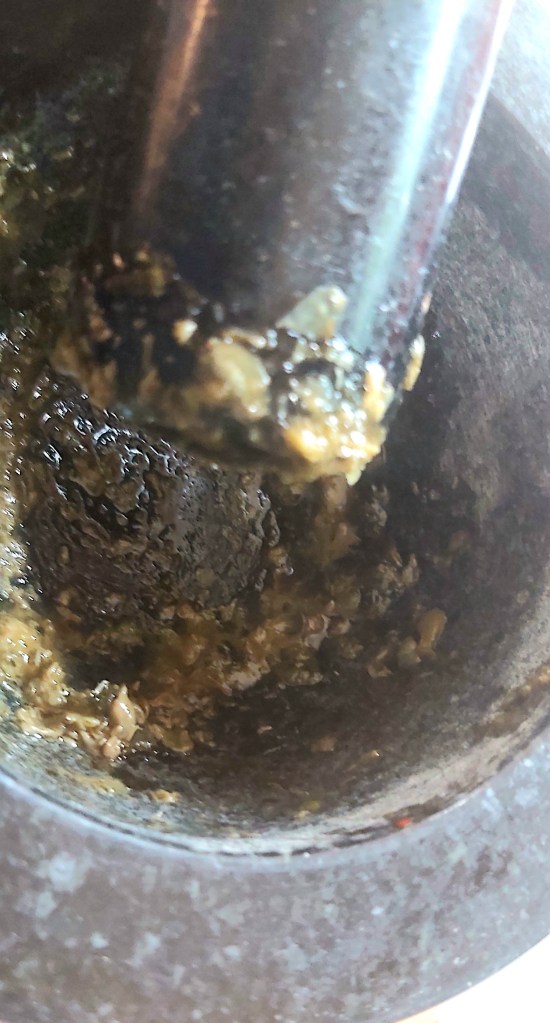 Grind garlic until incorporated into paste and add and mix into the paste: