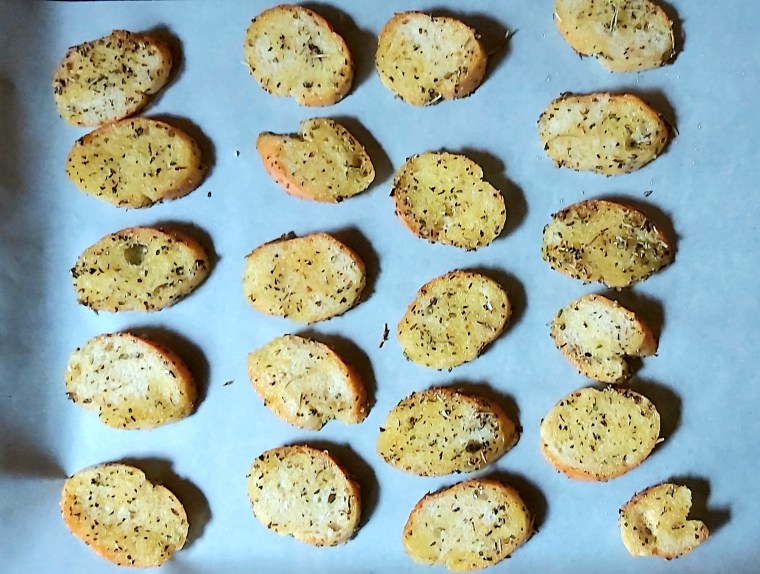 Toss bread in a bowl with the rest of the ingredients. Space out on a parchment-covered baking sheet and bake for twenty minutes at 375 for twenty minutes, flipping at the halfway mark.
