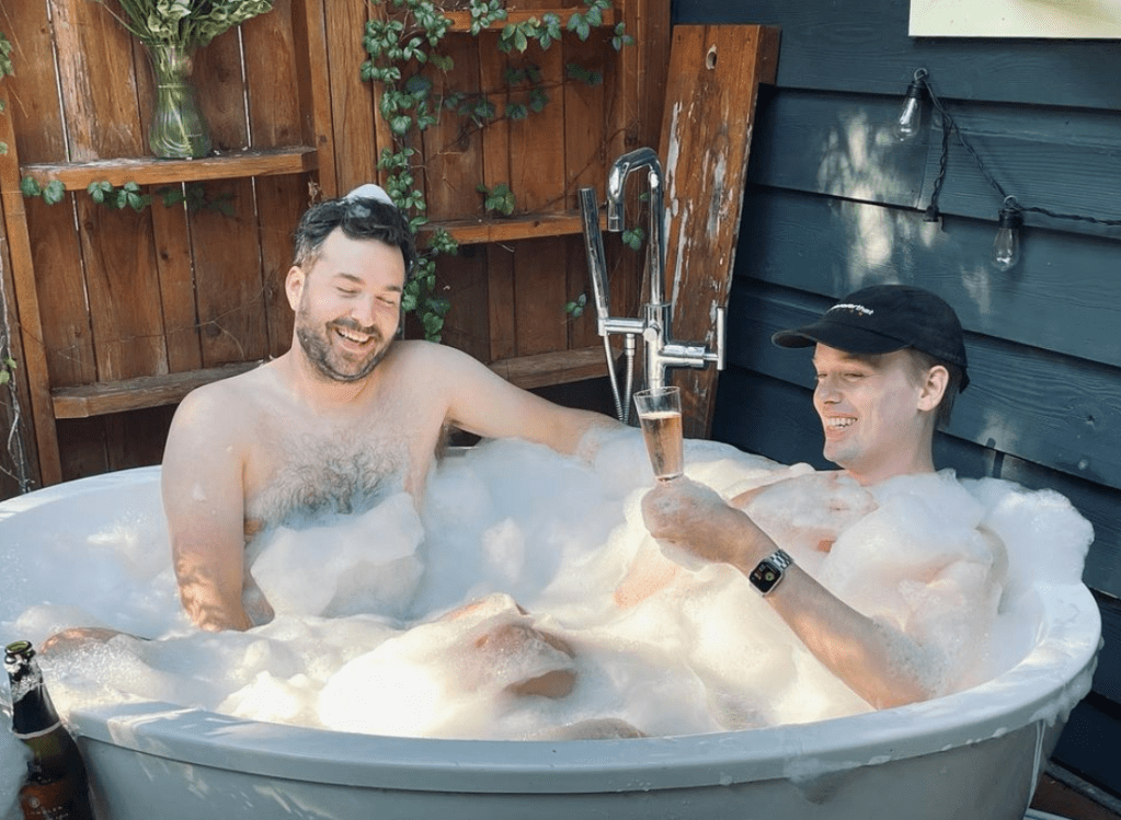 And after checking out our outdoor bathtub and sauna, Stefan had the brilliant idea of shooting a few PR pictures for their podcast in the tub, so we popped open some pink champagne, and they hopped into the tub. Producer Dan got some great shots (though we’ve yet to see the sauna pics!):