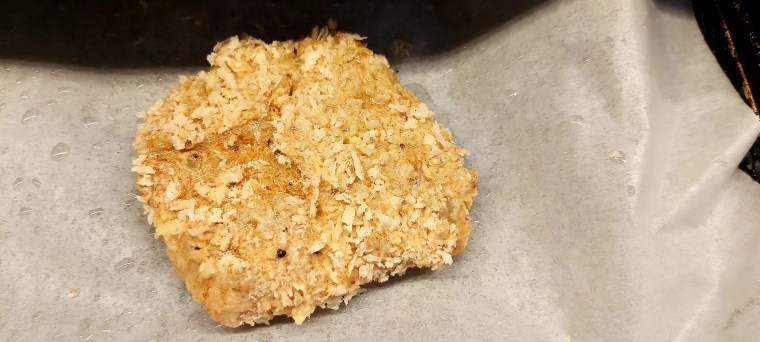 Place rice paper in your hand and add one pile of seitan. Wrap rice paper around seitan, shape into a patty, and place on cooling rack. Continue with the rest of the seitan.