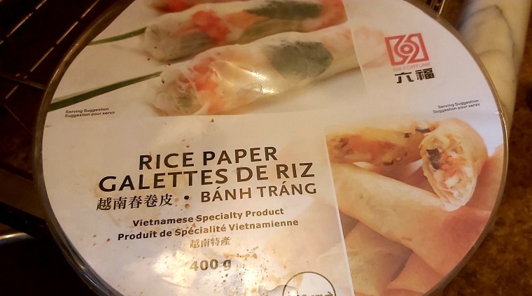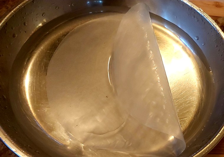 Fill a large flat dish with warm water and immerse one piece of ricer paper into water until soft and pliable.
