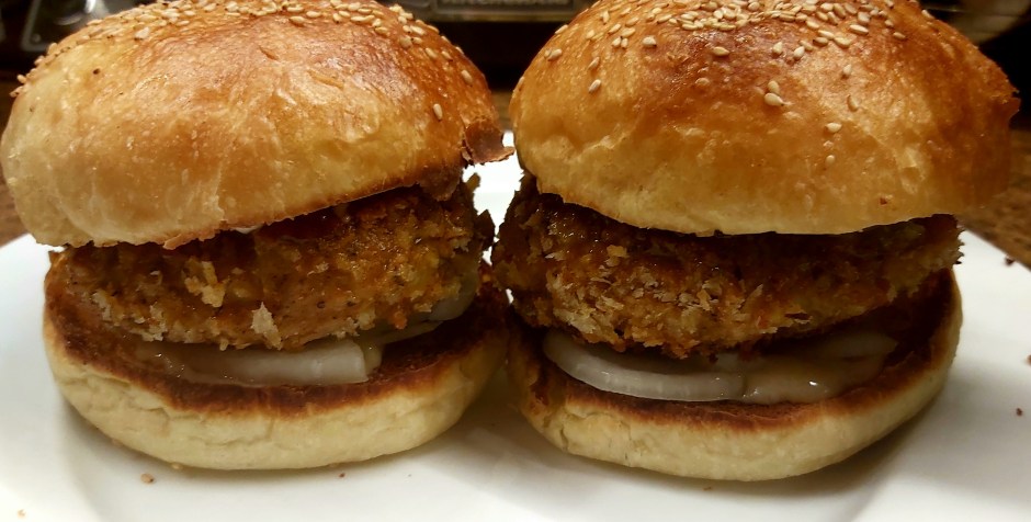 Once they’re done, slap those delicious patties on a tangzhong bun with onions, pickles, lettuce, and vegan mayo!