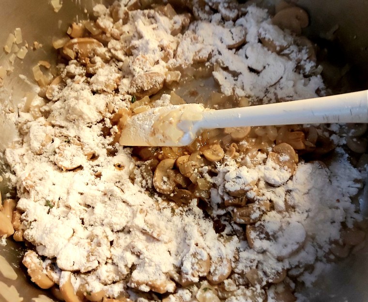 - Sprinkle mushrooms with flour, mix well and cook for two minutes. Add broth gradually while stiring, and bring to a boil. Reduce heat to low-medium heat and season with salt and pepper.