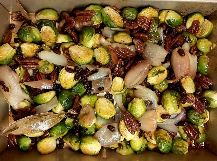 Sweet and Sour Brussels Sprouts with Pecans and Raisins