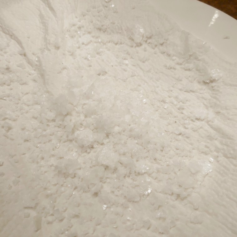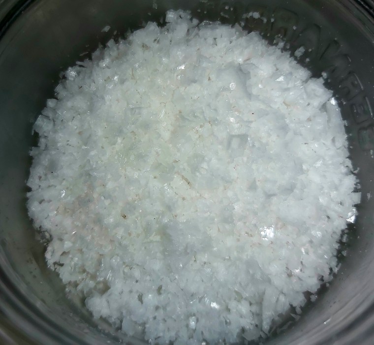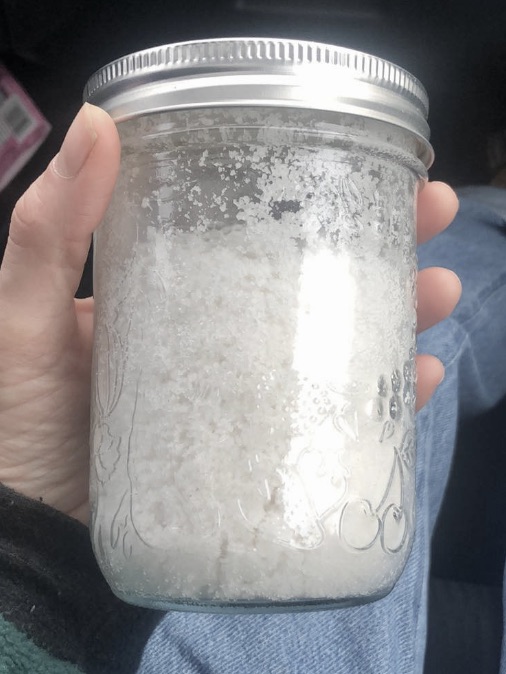 Once the water evaporated, I was able to scrape the crystals into a jar, and we have….FLAKY SALT!!!