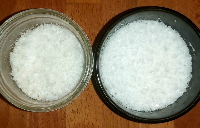 And here is Dana’s Grassy Point flaky salt (left) compared to commercial flaky salt (right):
