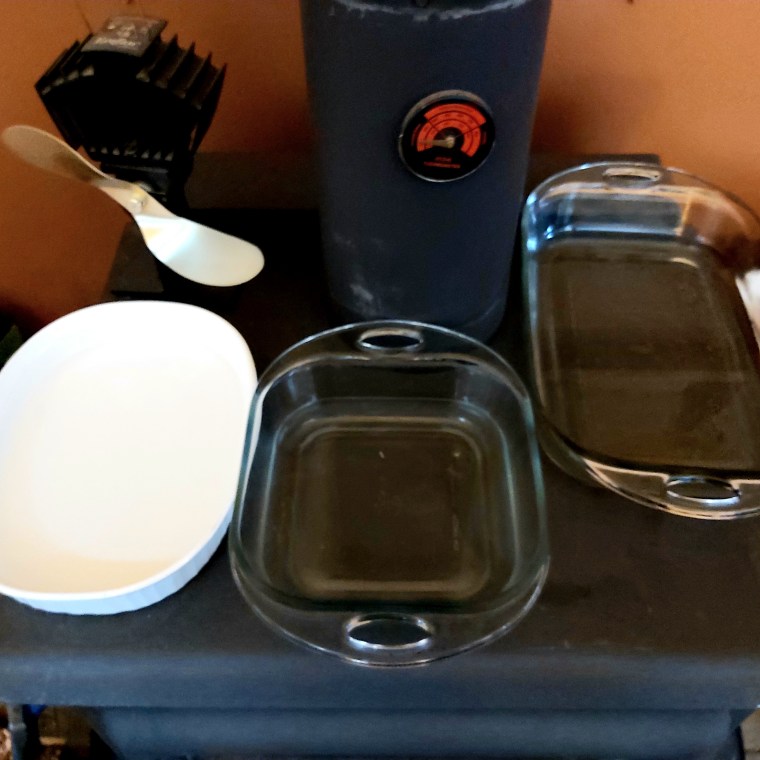 I poured the seawater into three low ceramic and glass casserole dishes and set them on the woodstove for about twelve hours.