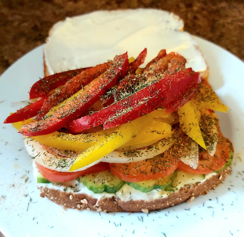 The first is this amazing vegetable sandwich. Em sent me a Tiktok post of a woman making and eating the sammie, and it looked so fresh and delicious, I knew I had to make it right away. A couple of tips: don’t try to use fancy bread like sourdough or ciabatta. I made the mistake of using focaccia, and it was okay, but not the same as a nice soft sandwich bread like Country Harvest Ancient Grains: