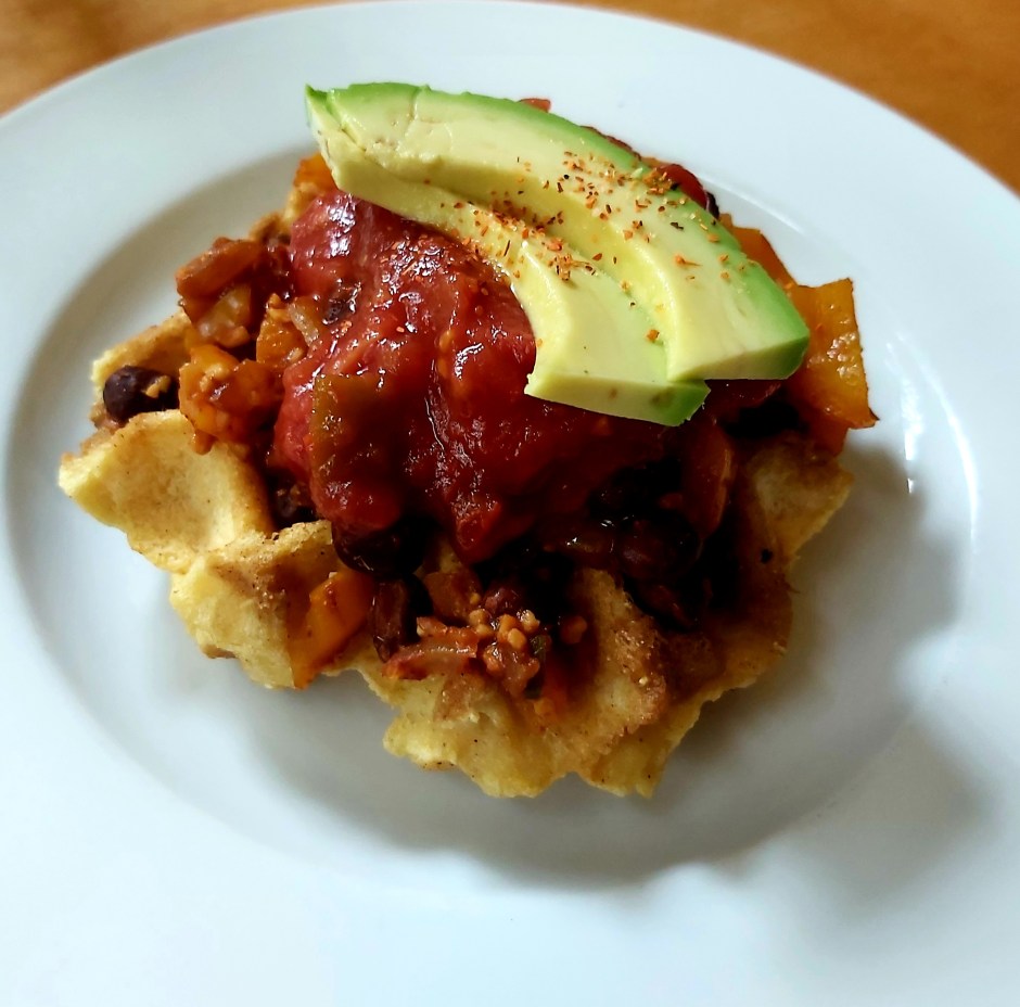 This recipe for waffles made of masa harina, corn meal, and almond flour is from Forks Over Knives, and while I didn’t adapt the waffle itself, I did take liberties with the “hash.”