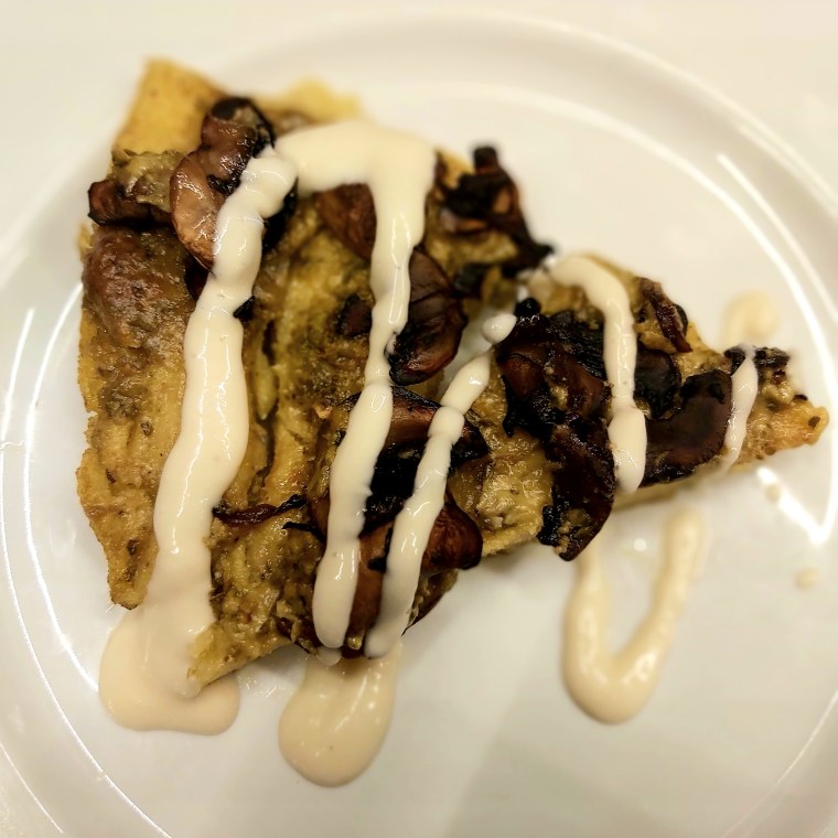 Another meal I’m making is Creamy-vegan-pesto-and-mushroom-onion flatbread with blue cheez drizzle and arugula, most of which is self-explanatory, except for the….