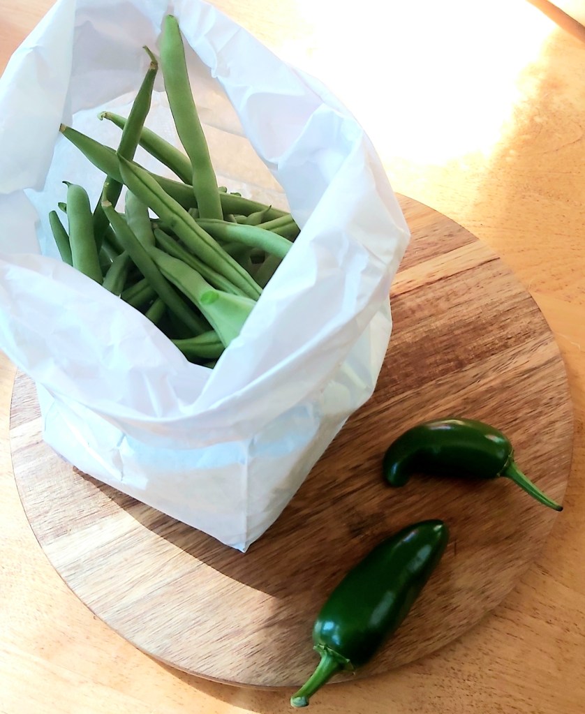 So the great thing about living in a small rural community is that when you are out for a walk in the summer or fall, you can just randomly come across a little stand with free vegetables or fruit. We came across just such a stand yesterday and picked up a pound of freshly harvested green beans and a couple of jalapeno peppers. Such a delight! I will be sure to go back to the address and drop off some jalapeno focaccia later this week. A few weeks ago, another neighbour was giving away bushelsful of early Transparent Apples, which are amazing apples for pie! I made a pie for us and a pie for him–vegan, of course, but he didn’t know that!