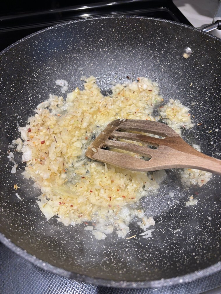 Once the oil shimmers, add the contents of the food processor to the pan and saute for six minutes. Season with…