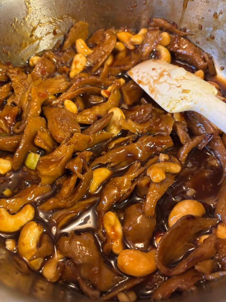 As an aside, I think soy curls would work just as well as seitan, but I had a little seitan roast in the freezer and thought I’d use that.