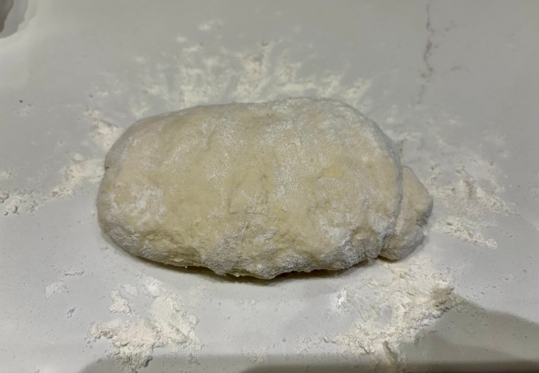 Pour out contents of food processor onto a floured counter and knead several times until the dough is tacky but not sticky. If you need more flour, add a bit at a time.