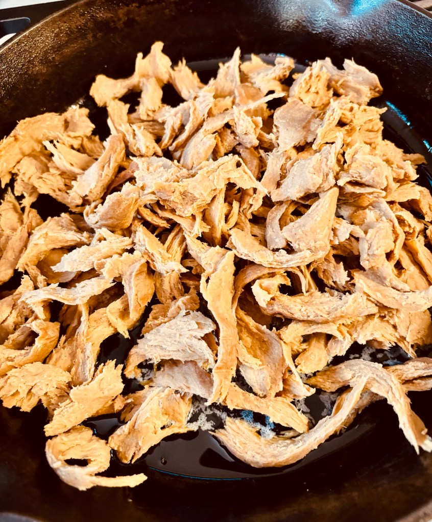 You can make this recipe with Butler’s Soy Curls as the chick’n, but I make it with my seitan chick’n, which I shred for the recipe. Here is the recipe: Chickwheat.
