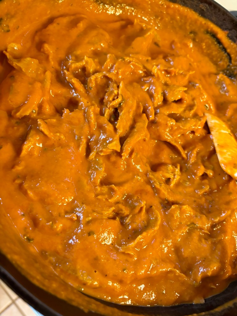 Next, saute about a 1/2 pound of your shredded chickwheat in an oiled pan for a few minutes until slightly browned, then add a jar of the KFI vegan butter chicken sauce…