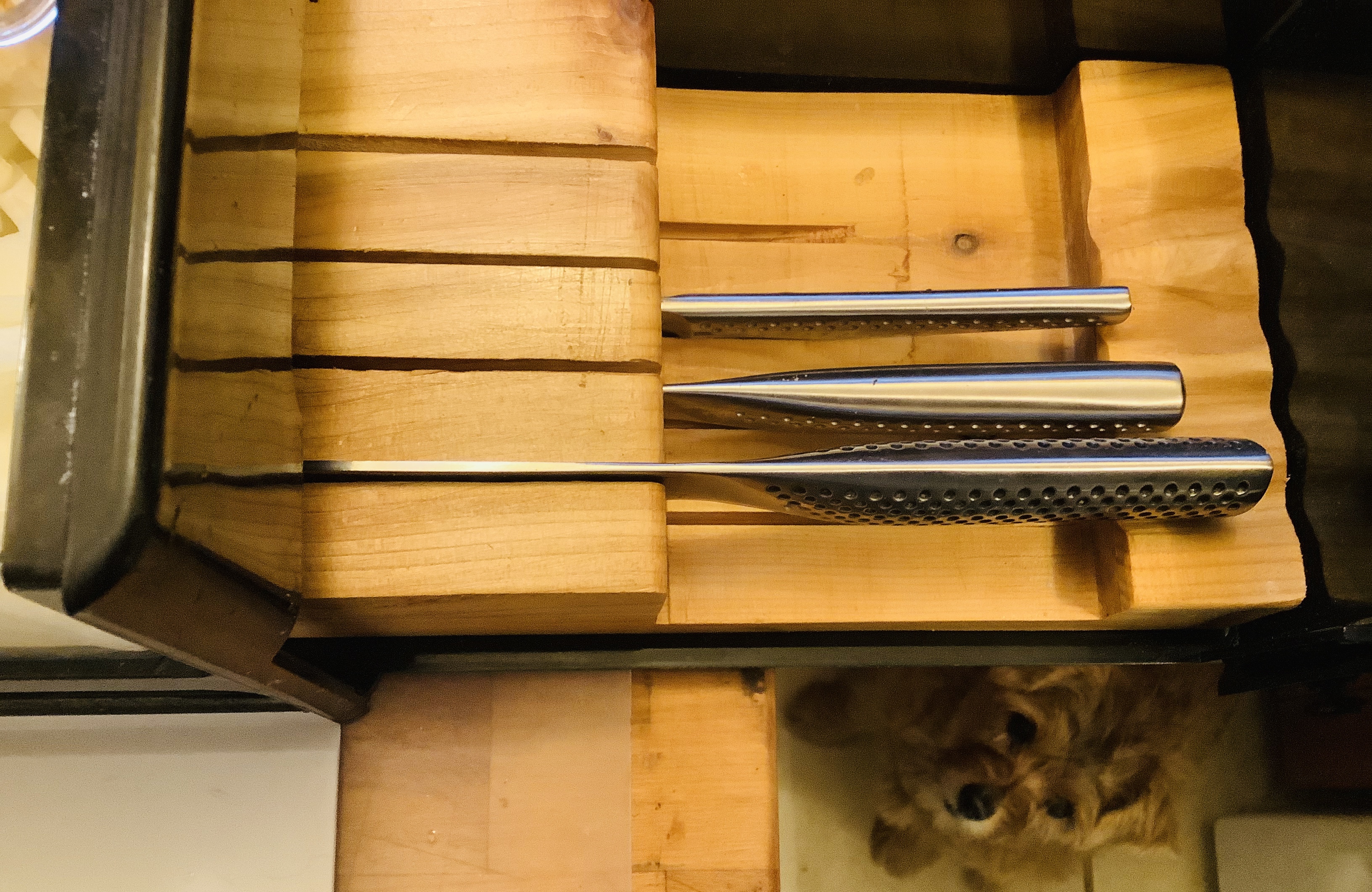 The drawer on the right can be used as a compost container or to hold knives, which is how I’m using it–notice James’ handiwork!