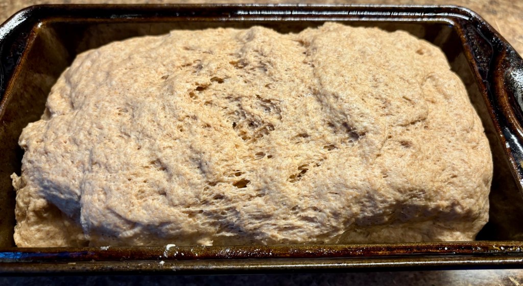 The dough program will be around 1.5 hours, but remove it after an hour and fifteen minutes and place in a covered greased loaf pan for fifteen minutes (in a warm spot). Now preheat the oven to 360 degrees.