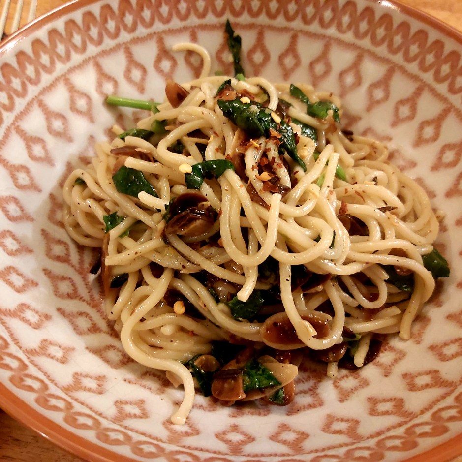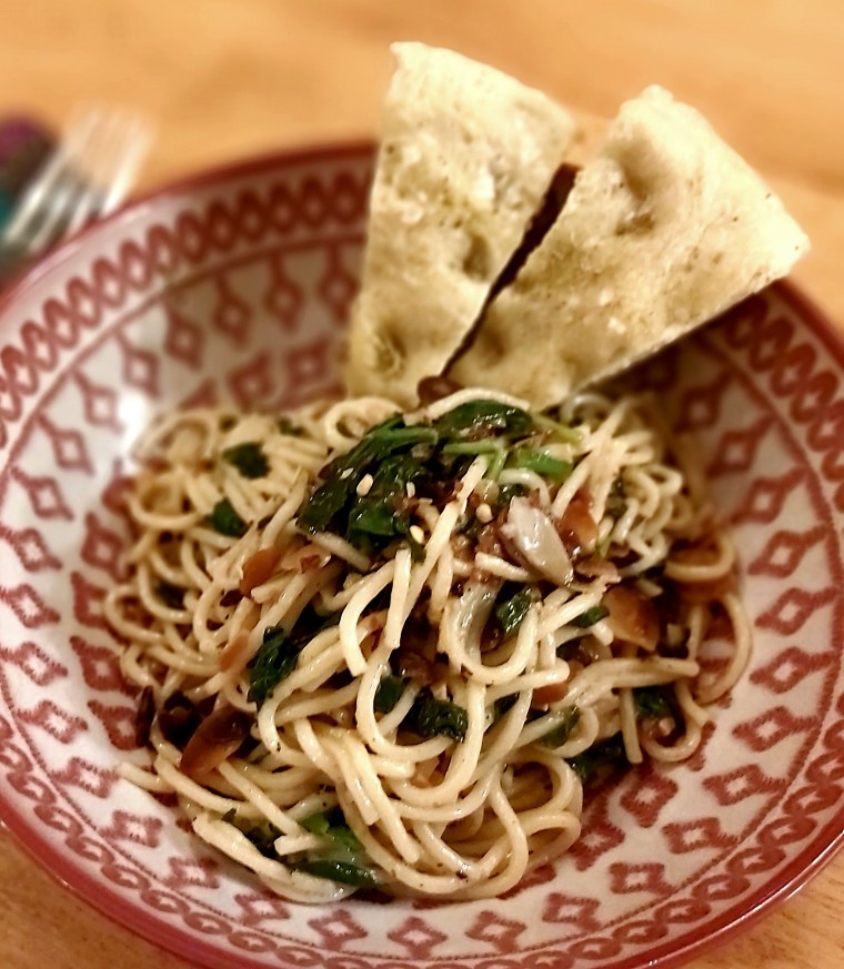 I’d baked a couple of focaccia earlier in the day, so the meal–including making the noodles from scratch–came together very quickly!